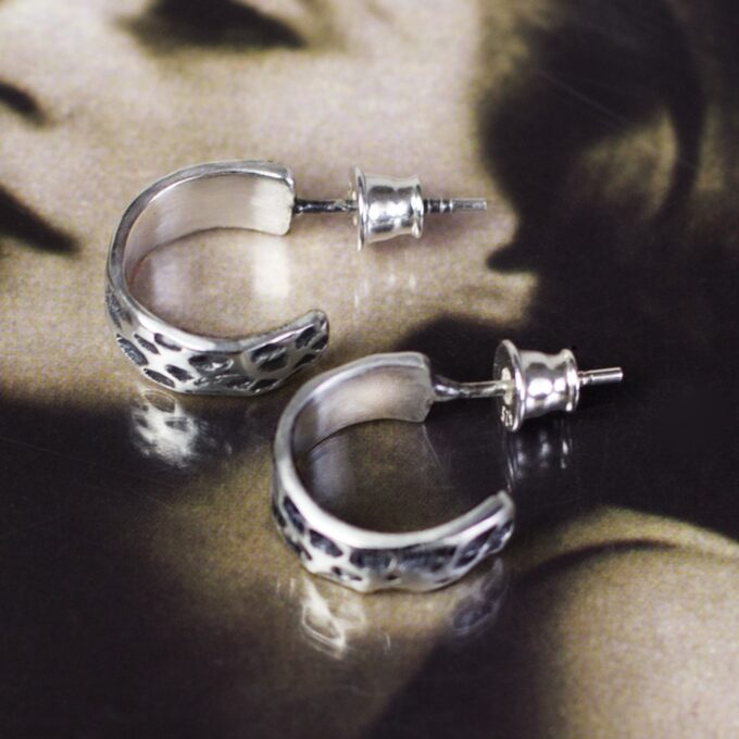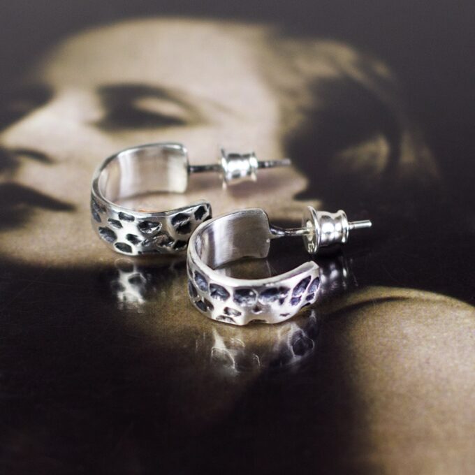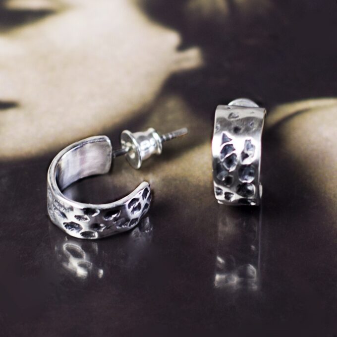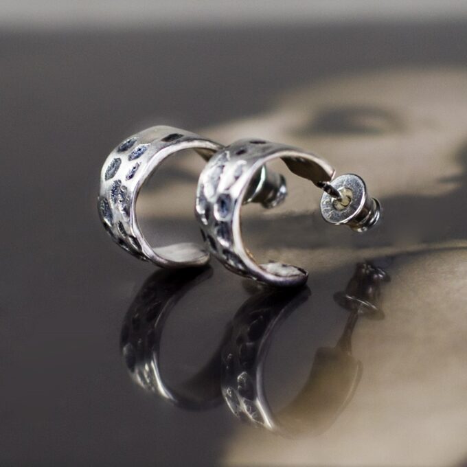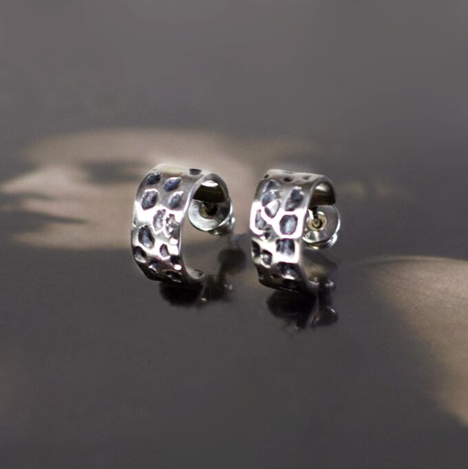 Srebrne kolczyki wykonane z oksydowanego srebra, z wyraźną, młotkowaną fakturą.