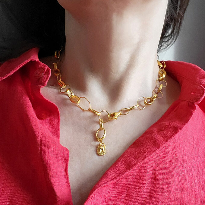 The Barbra necklace is a classic, it goes perfectly with a variety of styles, from casual, business to evening, and will never go out of fashion. A classic of the genre combined with a touch of artistic freedom. The rhythm of the Barbra necklace links is so-called ‘controlled chaos’, the same link shape is repeated at equal intervals, interrupted by a unique, ‘random’ one. The Barbra necklace is designed to be worn close to the neck, and can be fastened at any link, to suit a variety of necklines. It has been made from sterling silver, sample 925 plated with 24 gold. Length of the necklace -47 cm, including the clasp.