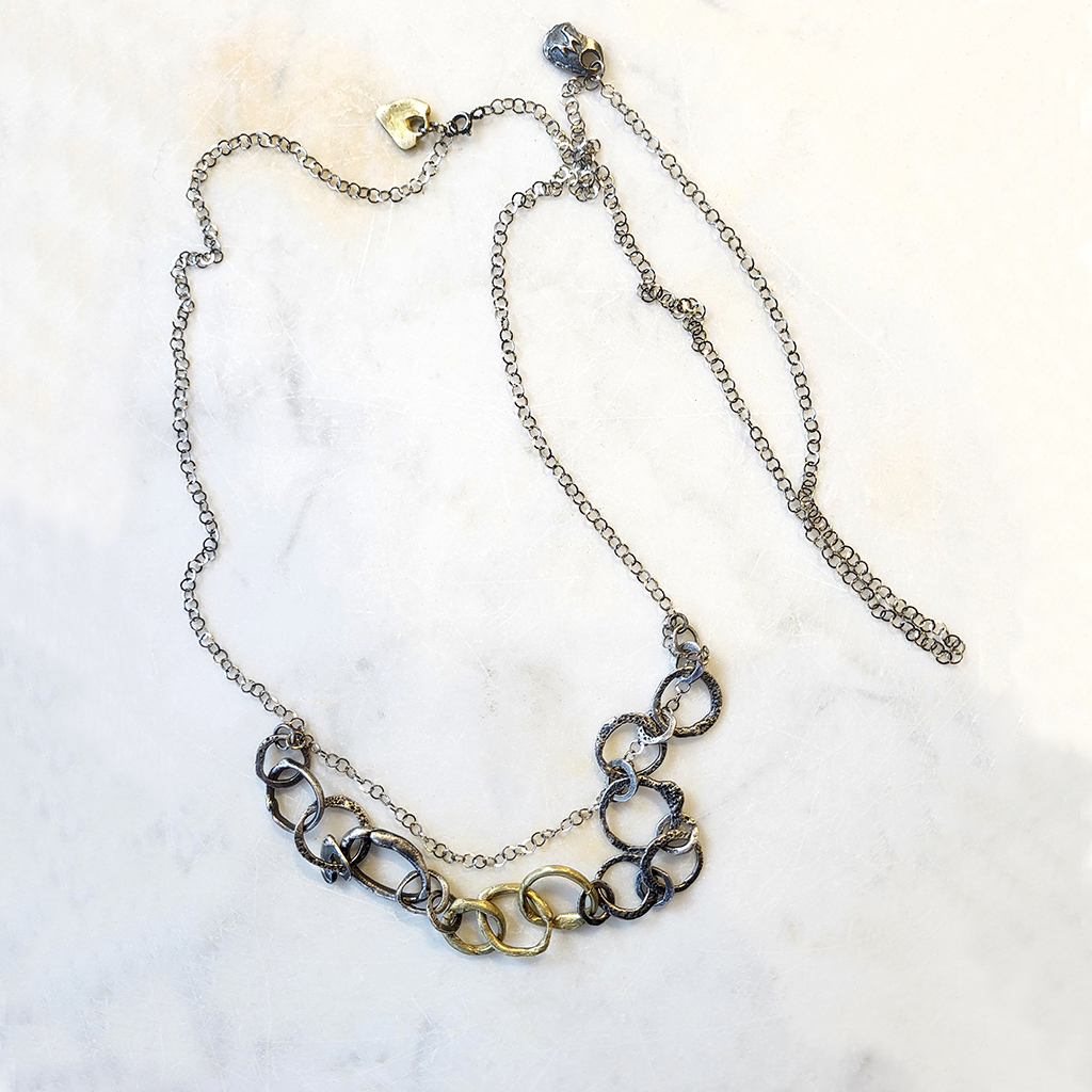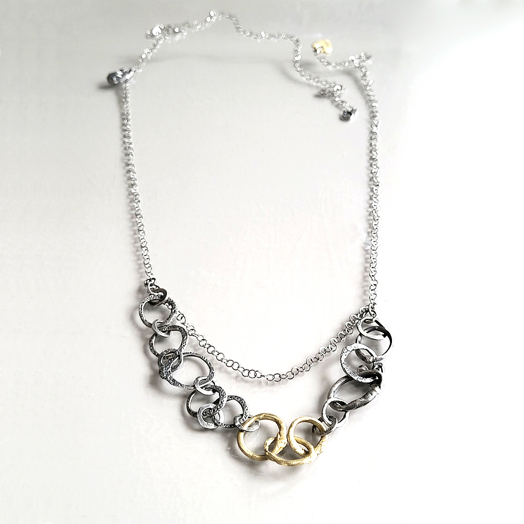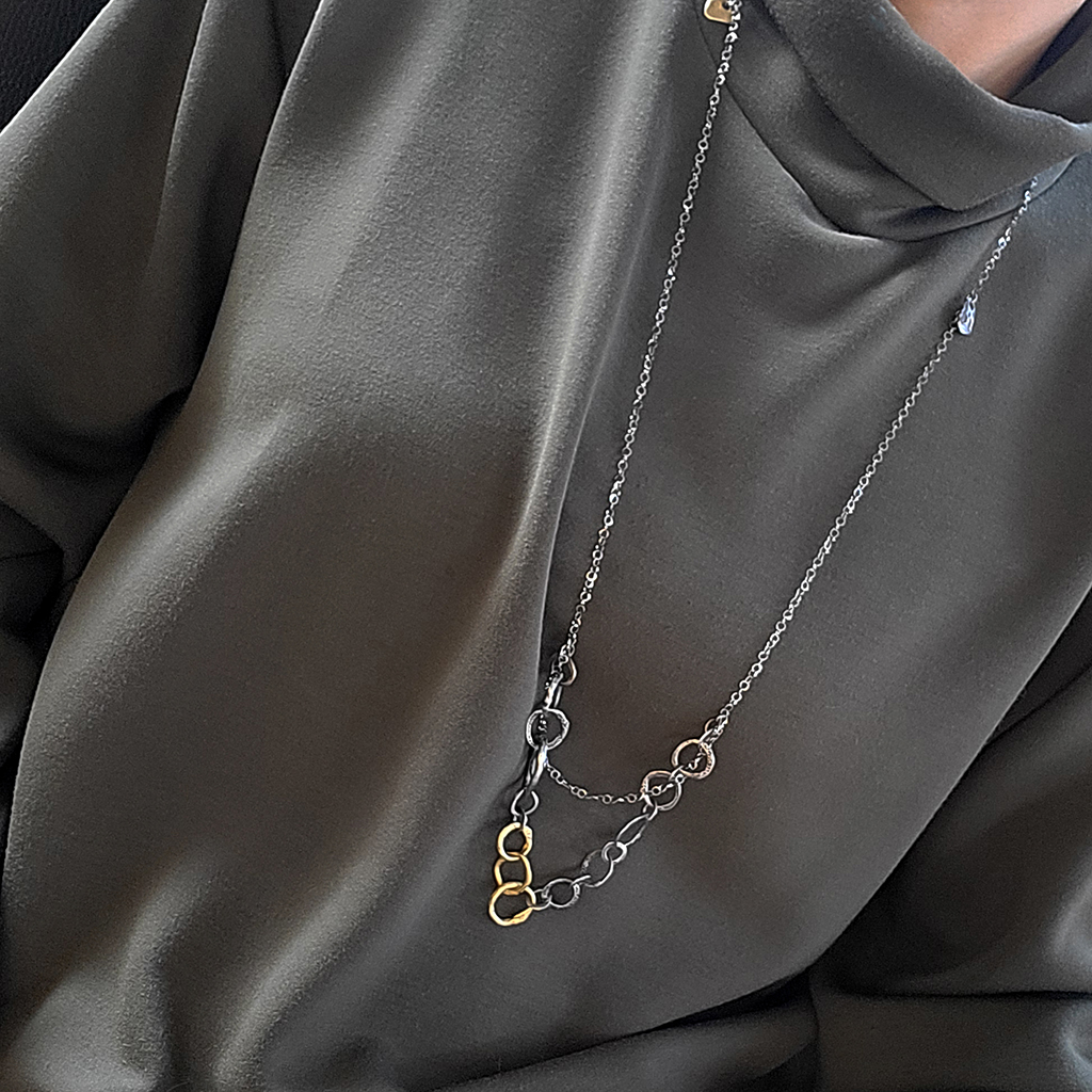 Długość naszyjnika: 92 cm, ogniwa wykonane są z mosiądzu, mosiądzu srebrzonego, stali.