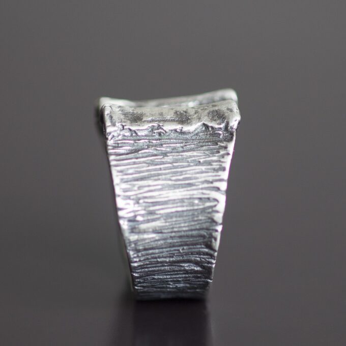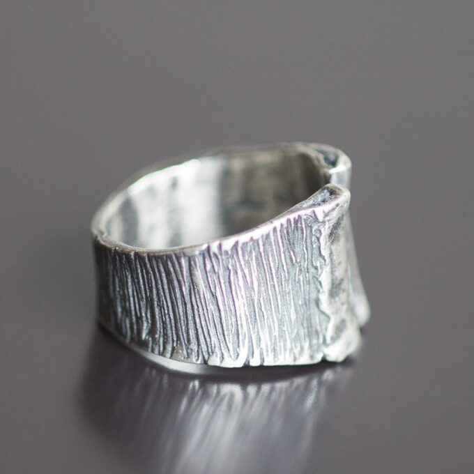 Srebrny pierścień Olga z wyraźną, rytą fakturą.