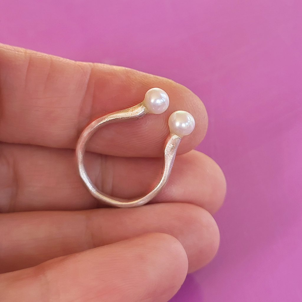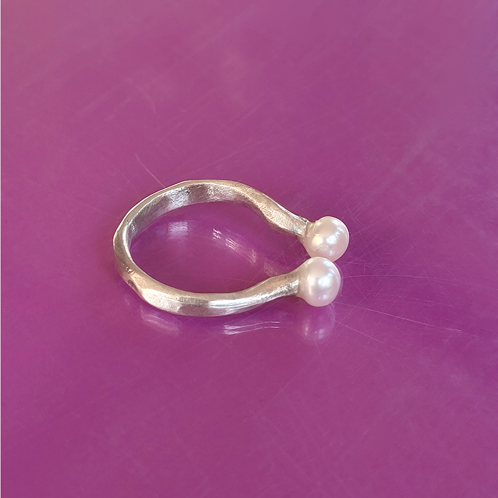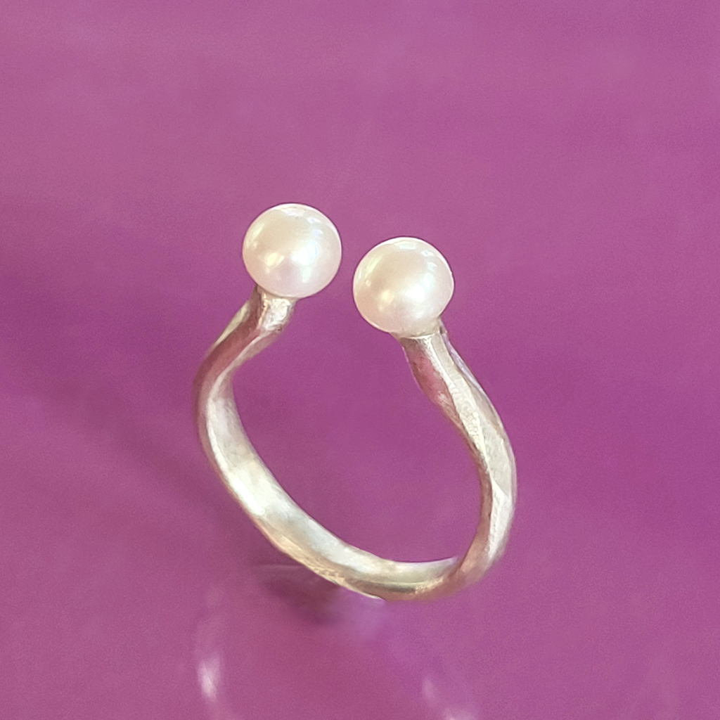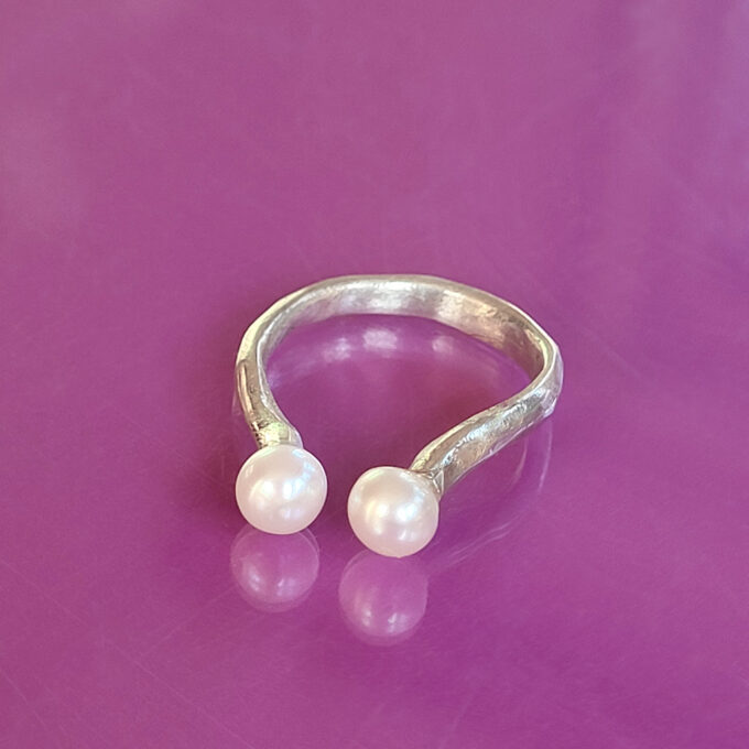 Pierścionek wykonany jest ze srebra- próba 925 i zwieńczony dwiema naturalnymi perłami. Rozmiar obrączki-13/17